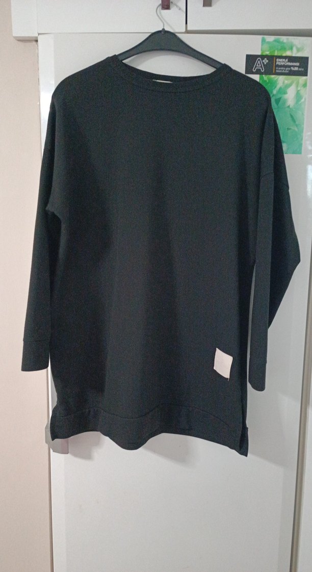 Siyah renkli, yuvarlak yakalı ve uzun kollu kadın sweatshirtü. Salaş kesimi ve normal midi boyuyla rahat ve şık bir görünüm sunar. Yumuşak ve sıcak kumaştan yapılmıştır, günlük kullanım için uygundur.