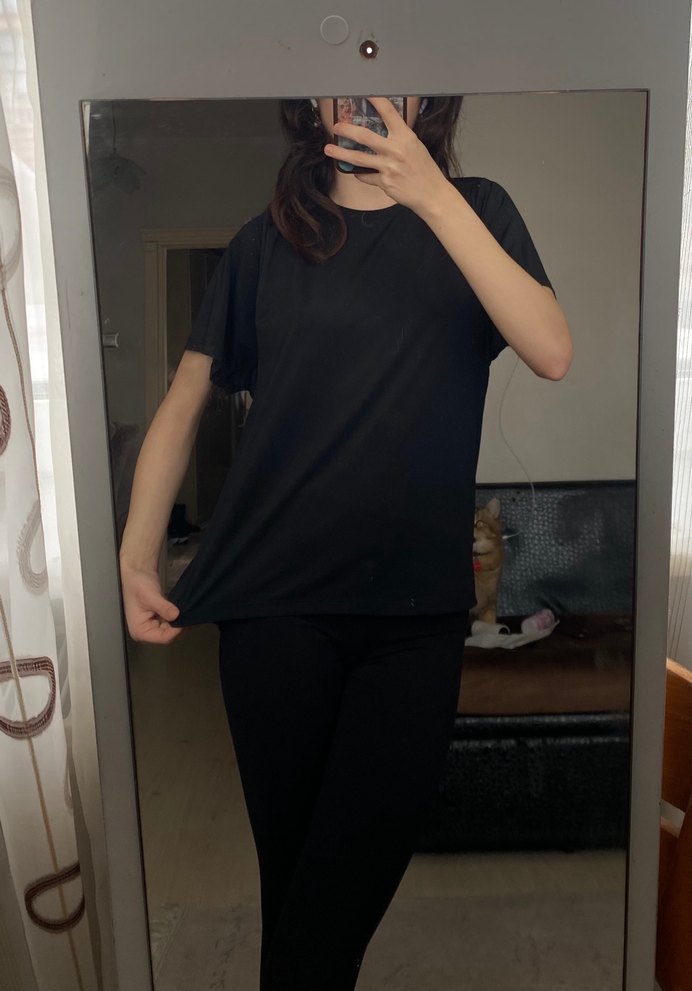 Siyah renkli, salaş kesim ve bisiklet yaka tasarımlı kadın tişörtü. Yumuşak ve ipeksi dokusuyla kısa kollu, normal midi boyda, günlük kullanıma uygun.