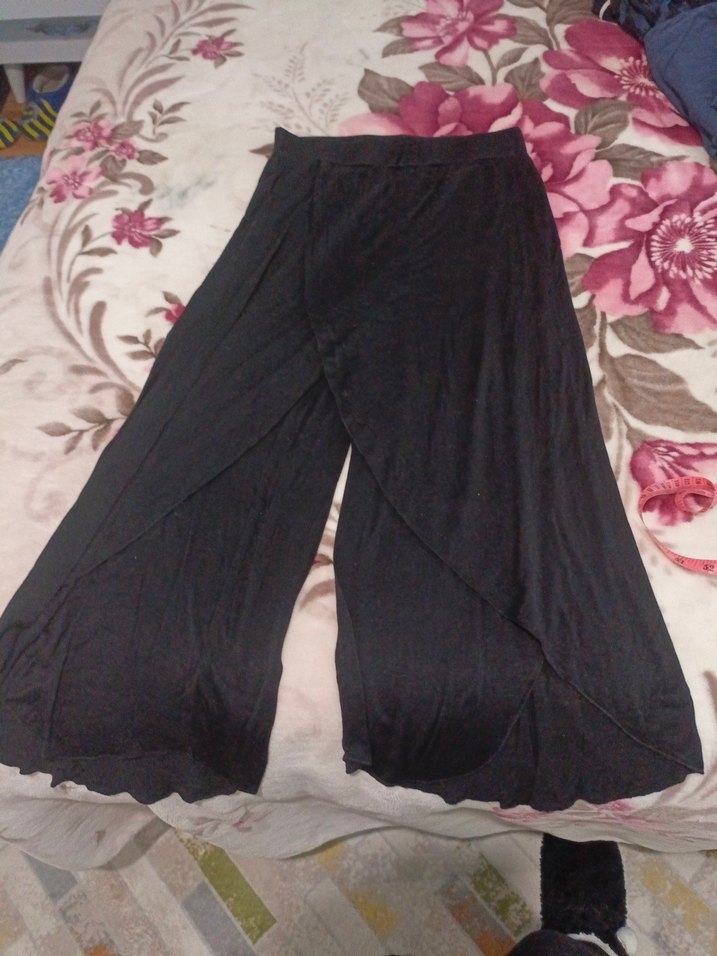 Siyah, uzun, salaş kesim ve drapeli tasarıma sahip kadın pantolonu, yumuşak ve ipeksi kumaştan üretilmiştir. Günlük kullanım için uygundur. boyu 90 cm