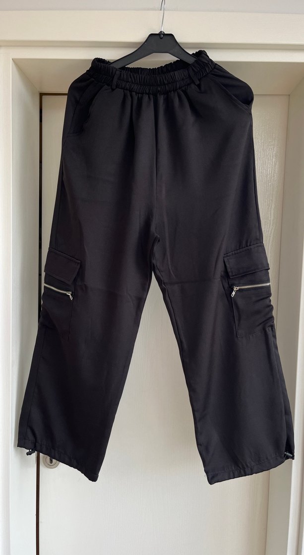 Yimuyu marka, siyah, salaş kesim, fermuarlı ceplere sahip, ipeksi dokulu midi boy pantolon. Lastikli bel ve rahat sokak stili sunar. Günlük kullanım için uygundur. Yanılmıyorsam kızım Japonya’da bir butikten almıştı. Çok şık, tiril tiril bir kumaşı var. Boy 95 cm.