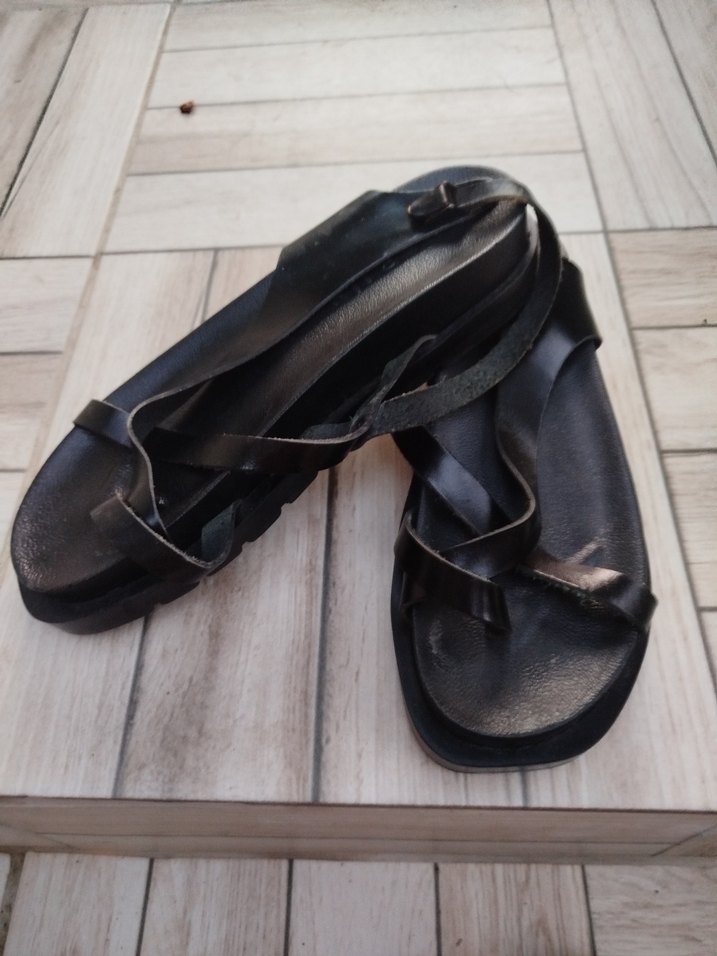 Siyah renkte, lastik malzemeden kadın dolgu topuklu sandalet. Tokalı ve minimalist gotik tarzda, günlük kullanıma uygun.
