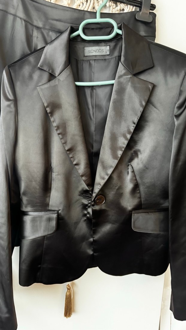 Siyah, saten dokulu kadın blazer ceket, kesik yaka ve düğmeli kapama ile. Uzun kollu, normal kesim, modern klasik tarzda ofis için uygun. ✨siyah saten etek takım 40 bedene uyumlu