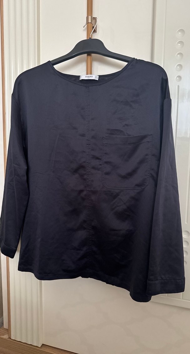 Siyah, saten kumaştan, uzun kollu, yuvarlak yakalı ve salaş kesim kadın bluz. Normal boyda, sade ve desen içermeyen minimalist tasarım. ✨