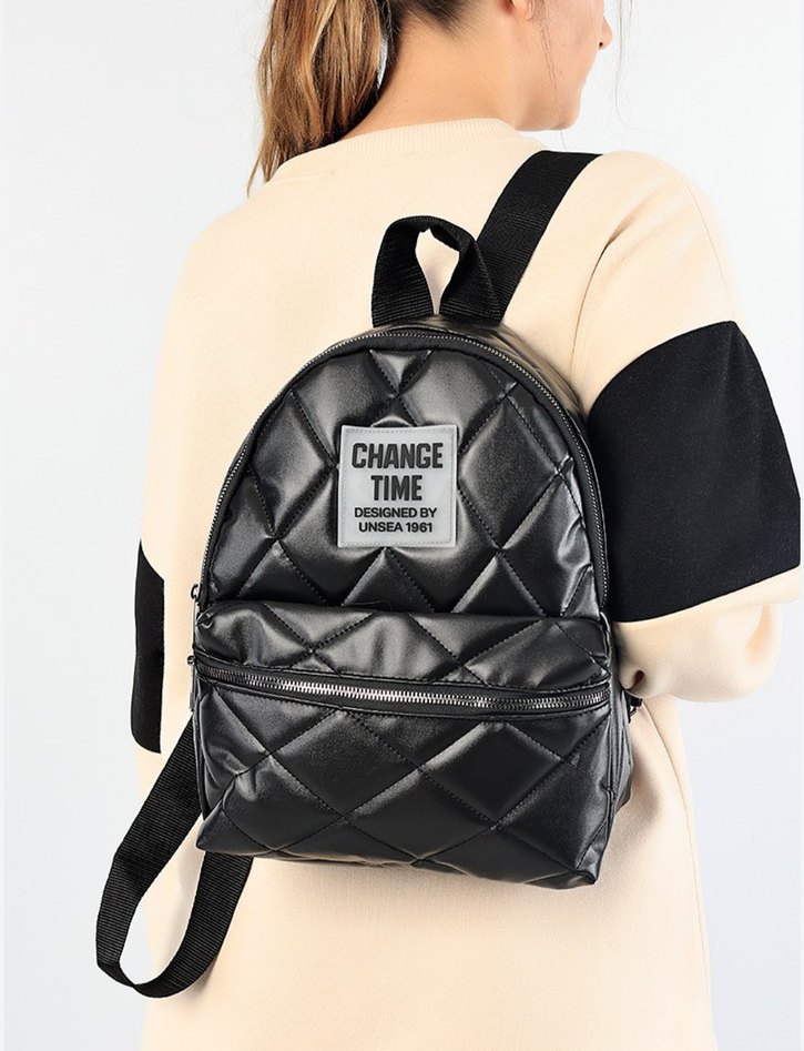 Kapitone dokulu, tokalı siyah sırt çantası. "CHANGE TIME" ve "UNSEA 1961" yazılı baskılı detaylar içerir. Rahat sokak stili için uygun. çok az kullanılmış sadece alt fermuari biraz zor kapanıyor hafifçe bastırarak kapatırsanız rahatlıkla olur hiç bir sorunu yoktur çok kullanışlı uygun koydum