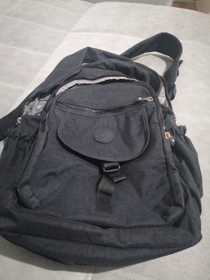 Siyah renkli, tokalı ve fermuarlı ceplere sahip kadın sırt çantası, dayanıklı sentetik kumaştan üretilmiştir. Günlük kullanıma uygun, trend sokak stili.