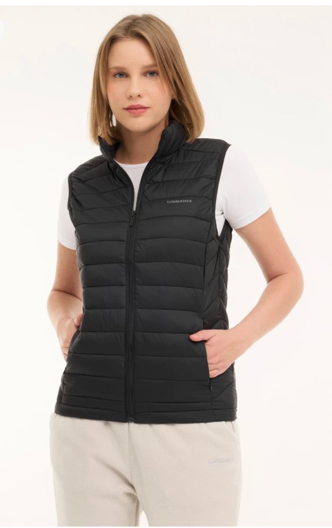 Dik yaka, fermuarlı, vücuda oturan kadın şişme yelek. Siyah renkte, düz ve sentetik kumaştan üretilmiştir. Rahat günlük sokak stili için uygundur.