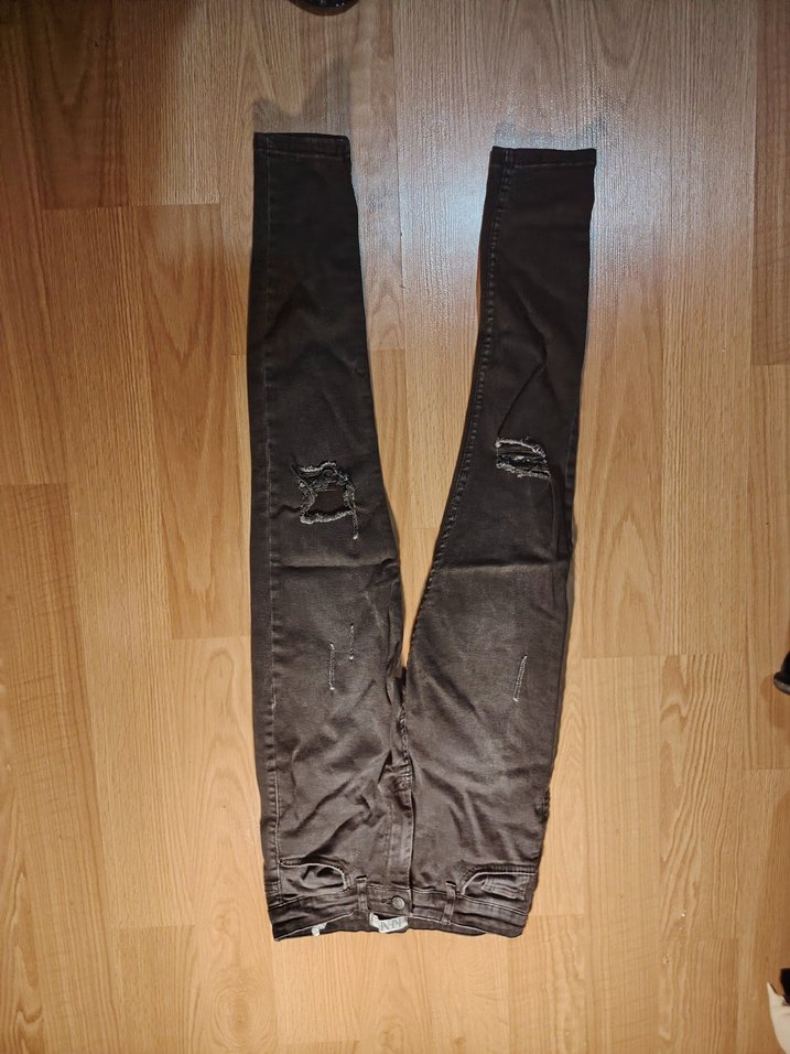 Siyah, dar kesim, tokalı denim kot pantolon. Midi boyda ve hafif yıpranmış detaylara sahip. Günlük sokak stili için uygun, grunge punk havasında.