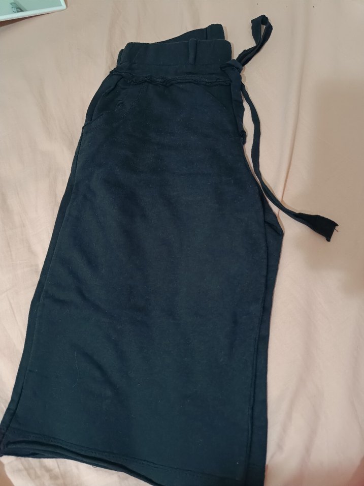 Siyah, midi boy, bol kesim ve kemerli kadın pantolonu. Sentetik kumaştan, günlük rahat sokak stili için uygundur.