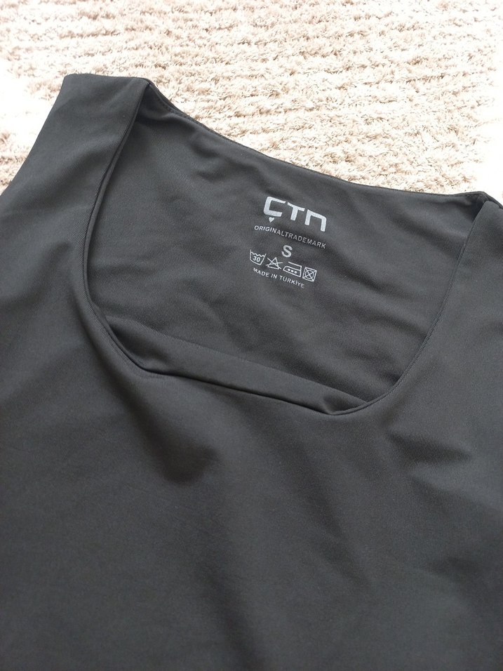 Siyah, kolsuz tişörtü, yuvarlak yakalı ve vücuda oturan kesime sahiptir. Esnek sentetik kumaştan üretilmiş olup spor ve gündelik kullanıma uygundur. İçinde CTM marka etiketi bulunur. marka temsilidir