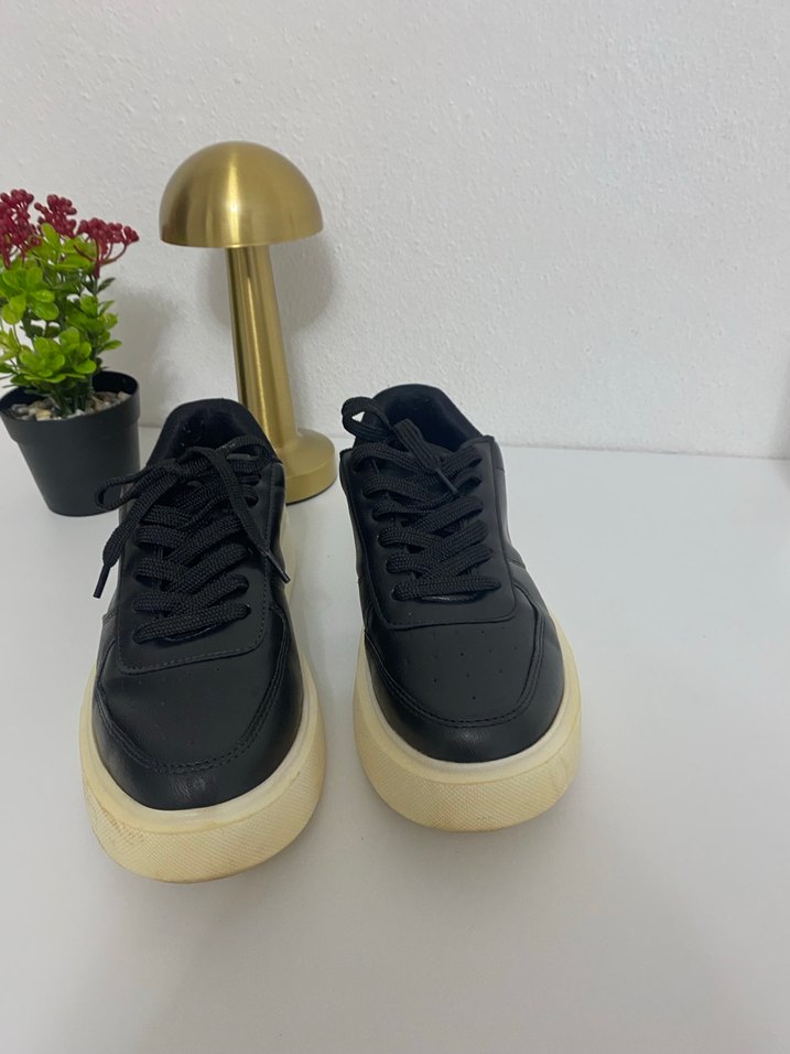 Siyah minimalist tasarımlı, kauçuk tabanlı kadın spor ayakkabısı. detaylarla sokak stiline uygun, günlük kullanıma rahat ve şık.