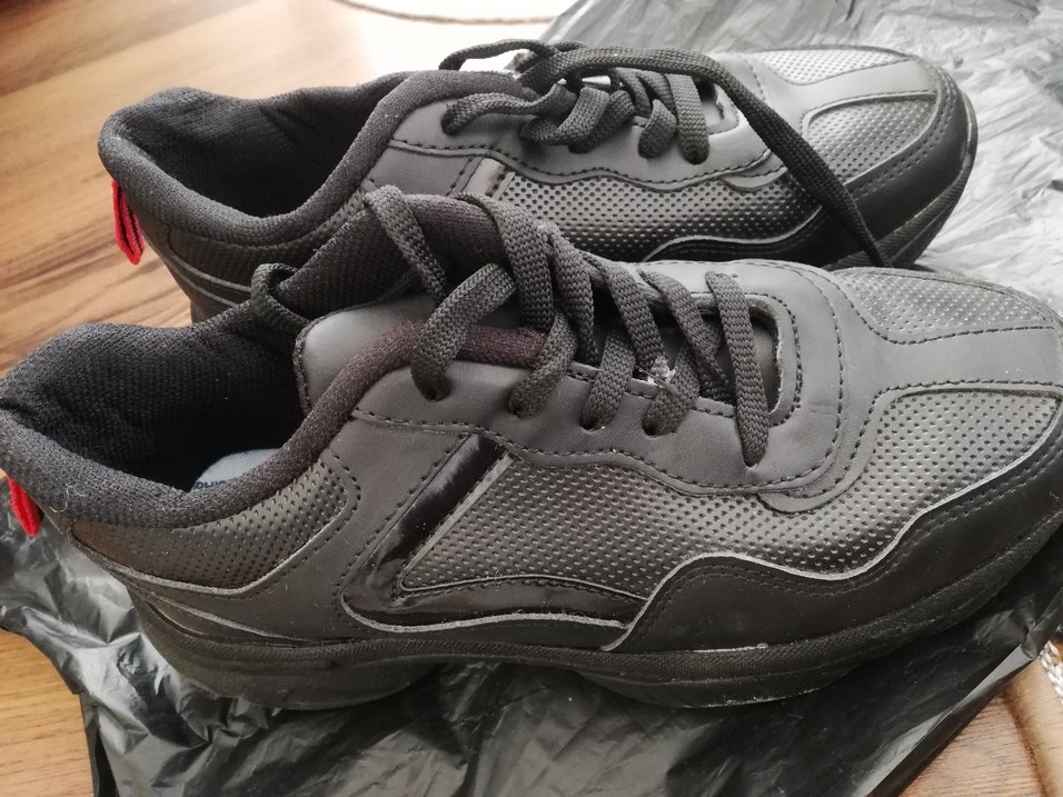 Siyah kadın spor ayakkabısı, stiletto topuklu ve bağcıklı, velcro bantlıdır. Kauçuk malzemeden üretilmiş, sportif ve sokak tarzına uygundur.