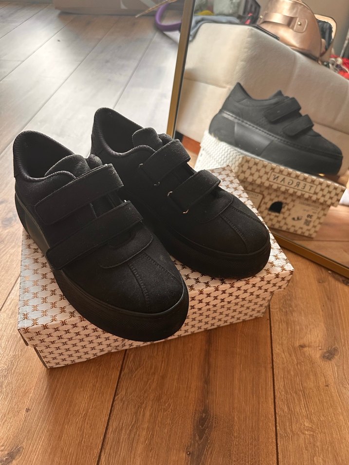 Siyah kadın spor ayakkabılar, platform topuklu ve cırt cırtlıdır. Kauçuk malzemeden yapılmış, günlük rahat sokak stili için uygundur.