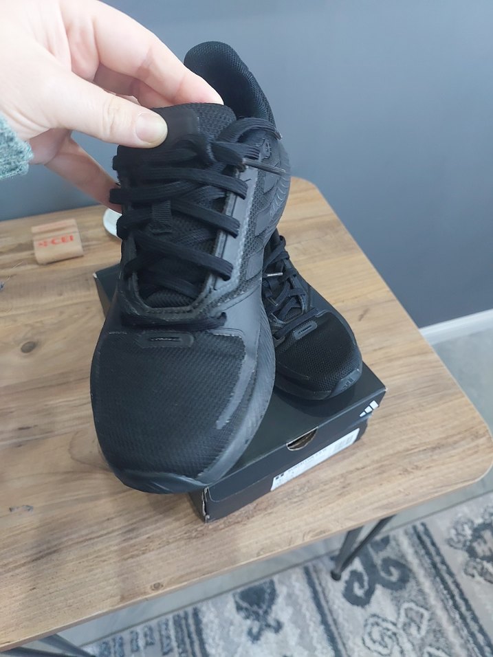 Siyah, desen içermeyen kadın spor ayakkabısı, velcro ve bağcıklı kapama ile. Stiletto topuk ve kauçuk tabanlı, spor ve günlük kullanım için uygundur.