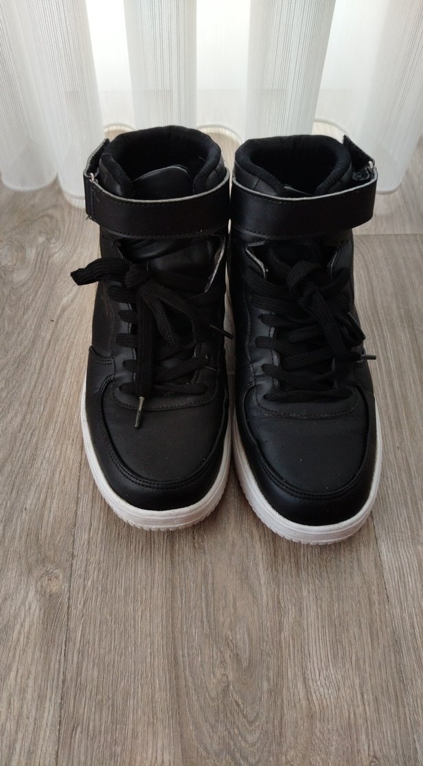 Siyah kadın spor ayakkabısı, cırt cırtlı ve kauçuk tabanlıdır. Sokak giyimi ve athleisure tarzı için uygundur, sportif rahat görünüme tamamlar. orjınaldr çok hafıt ayagımı sıktıgı ıcın ıkı üç defa anca gıyıldı