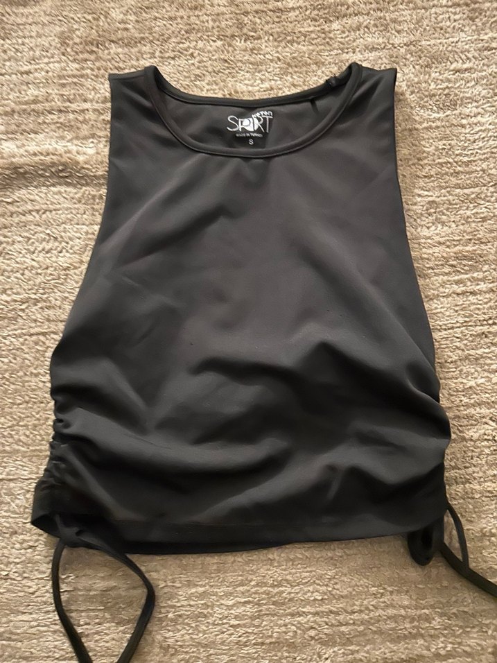 Kolsuz, yüksek yakalı ve vücuda oturan siyah crop top. Pürüzsüz sentetik kumaştan, spor ve günlük kullanıma uygun. Yanları büzgülü çok güzel gösteriyorr