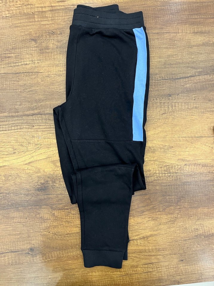 Siyah, mavi yan şeritli, rahat kesim ve lastikli bel bantlı erkek spor eşofman altı. Yumuşak ve sıcak kumaştan, spor ve günlük kullanım için uygundur. ♂️
