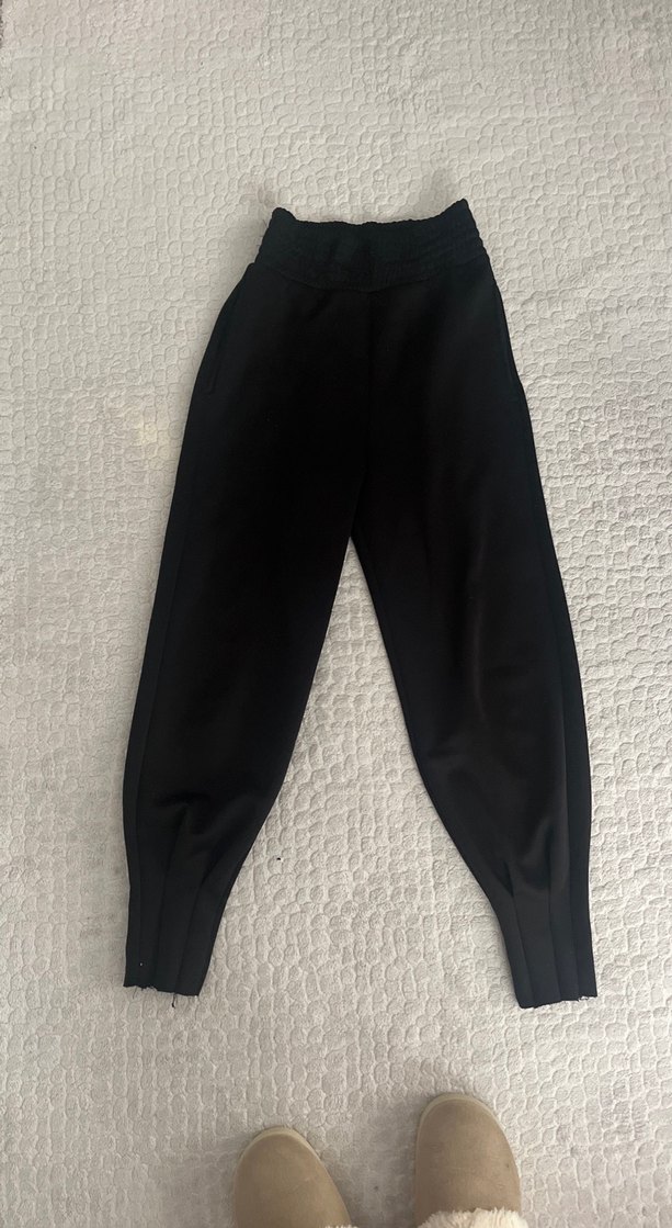 Bu siyah, dar kesim kumaş pantolonlar normal midi boydadır ve yumuşak, sıcak bir dokuya sahiptir. Spor sokak stili için tasarlanmış, zahmetsiz şıklık sunar.