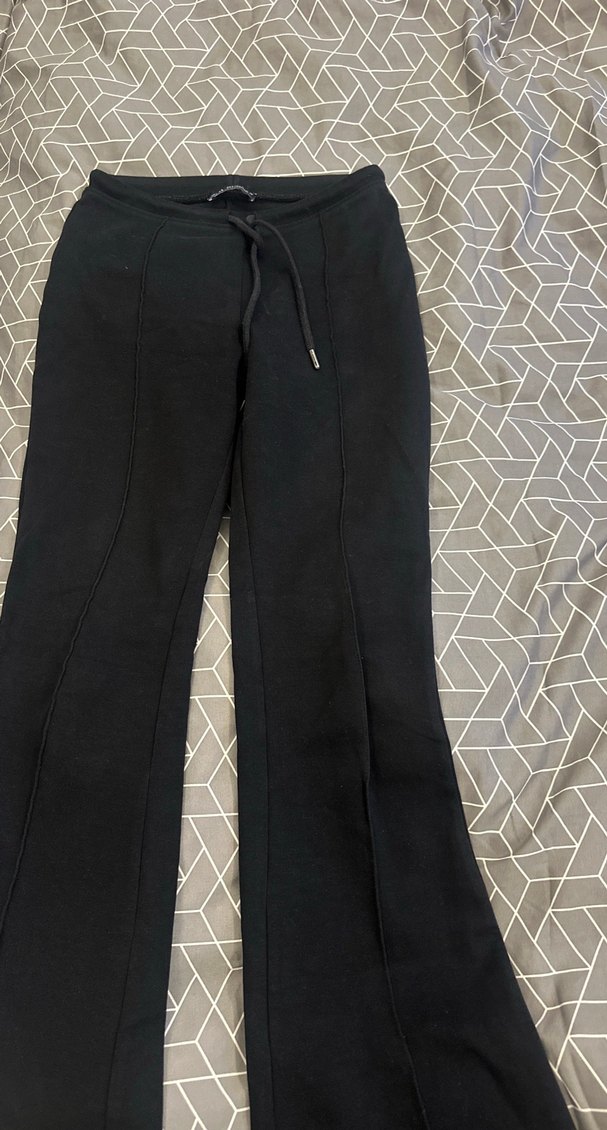 Siyah, belden bağlamalı ve yırtmaç detaylı, günlük kullanıma uygun kadın spor kumaş pantolon.