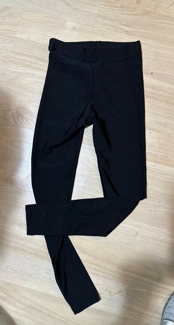 Siyah, elastik bel bantlı, sentetik kumaştan kadın spor tayt. Günlük sokak stili için sade ve temel tasarım.