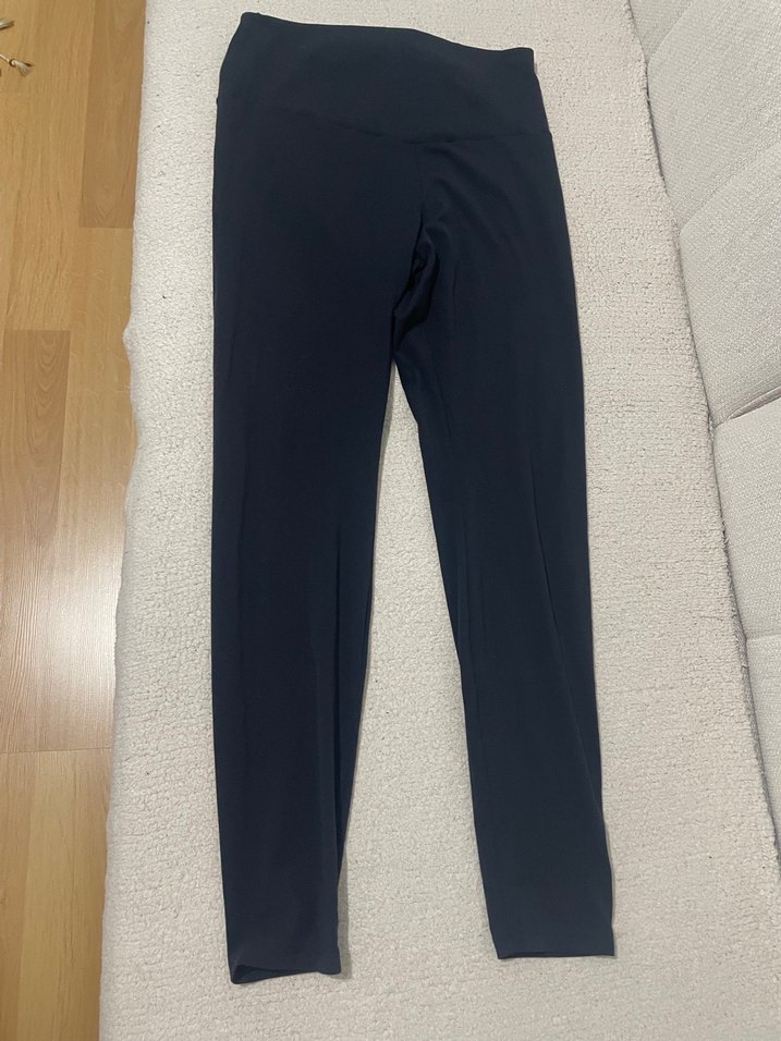 Siyah, düz, sentetik kumaştan, normal boyda ve dar kesim kadın spor tayt. Spor için uygun, rahat ve şık tasarıma sahiptir.birkaç kez giyildi