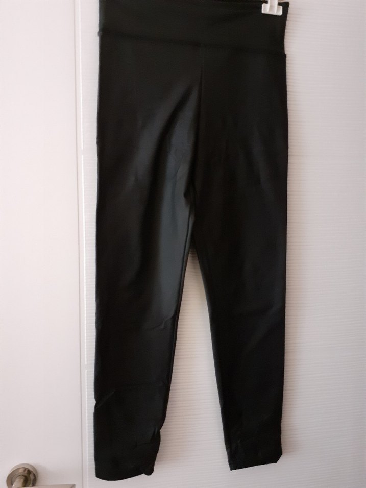 Esnek sentetik kumaştan yapılmış, siyah renkli, dar kesim kadın taytı. günlük kullanıma uygundur. deri görünümüdür