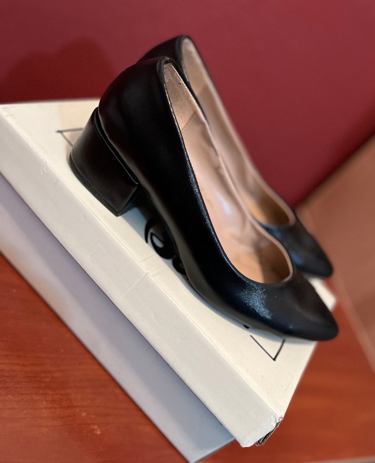 Siyah, tokalı ve blok topuklu Lastik malzemeden yapılmış, desen içermeyen klasik ve çağdaş ofis tarzına uygun.