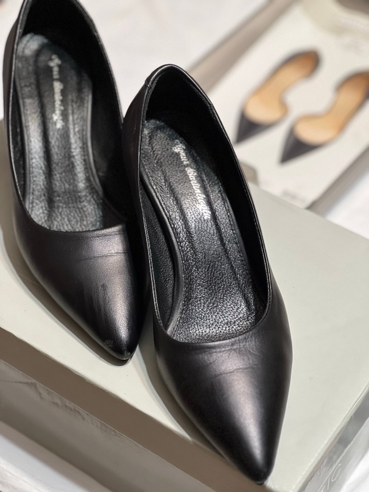 Siyah, sivri burunlu ve gerçek deri malzemeden yapılmış kadın stiletto topuklu ayakkabılar. Ofis için klasik zarafet ve gotik tarz sunar.