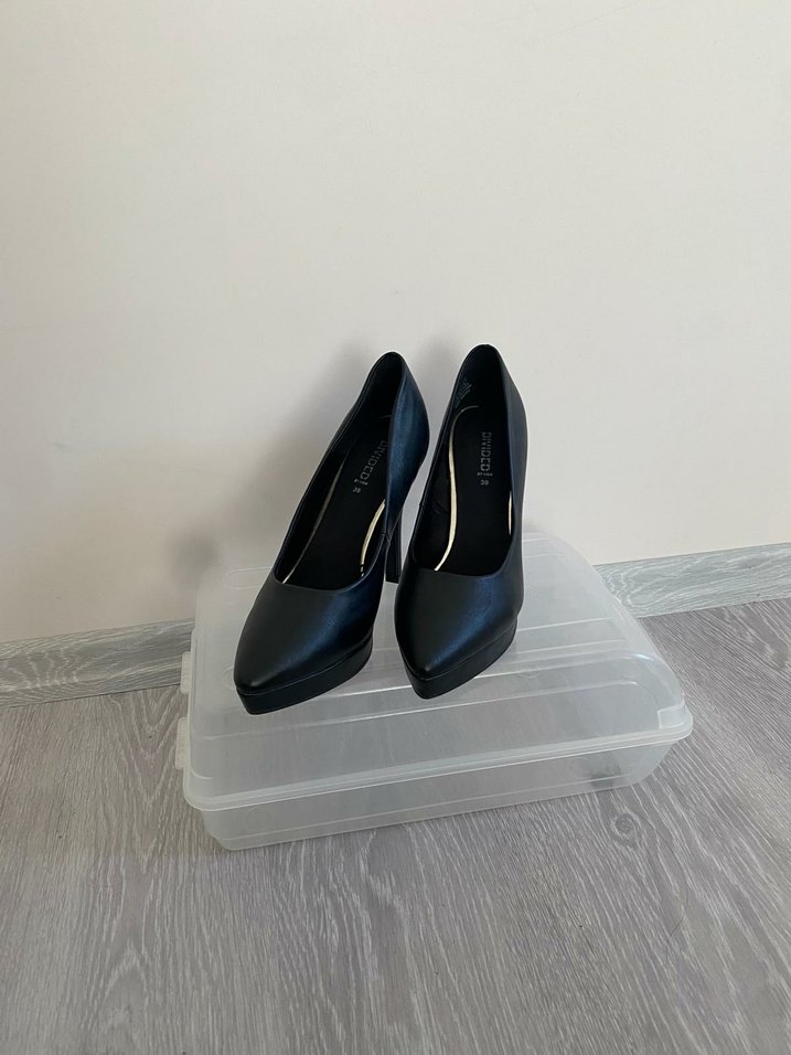 Siyah kadın stiletto, kauçuk malzemeden yapılmış, modern klasik tarzda ve ince topuklu. Ofis için uygun, zarif ve sade bir şıklık sunar.