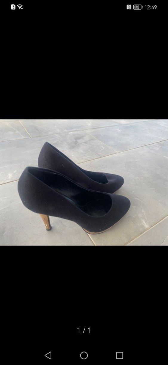 Siyah stiletto topuklu, kauçuk tabanlı klasik ve modern tasarım. Desensiz, ofis için uygun, zahmetsiz şıklık sunar.