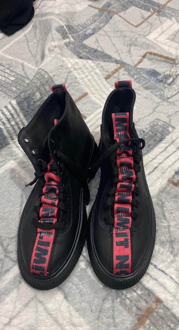 Siyah kauçuk materyalden, stiletto topuklu ve cırt cırt detaylı kadın street wear bot, rock punk havasıyla günlük kullanıma uygun.
