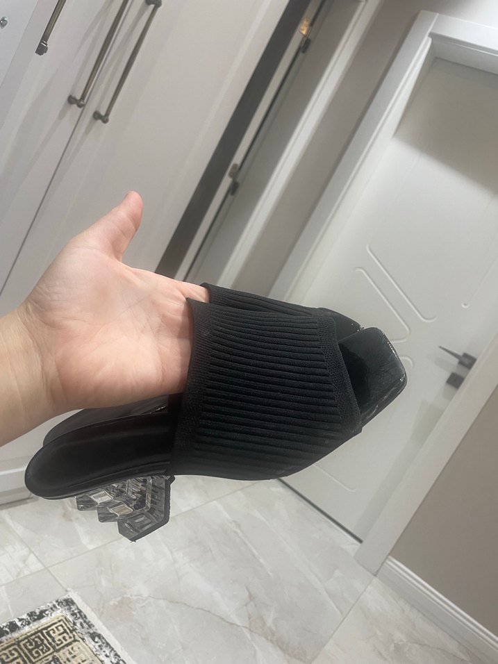 Siyah, velcro bantlı kadın terlik, stiletto topuklu ve şeffaf topuklu, minimal sokak stili için kauçuk malzemeden üretilmiştir.