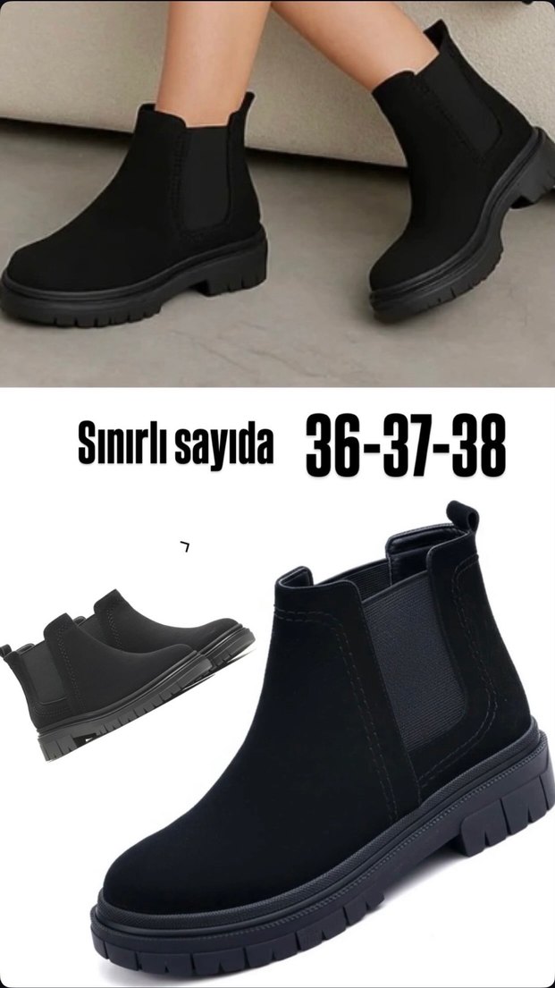 Siyah lastik malzemeden, blok topuklu, desen içermeyen bu botlar günlük sokak stili için uygundur. 36-37-38 numaralarda, sınırlı sayıda mevcuttur.