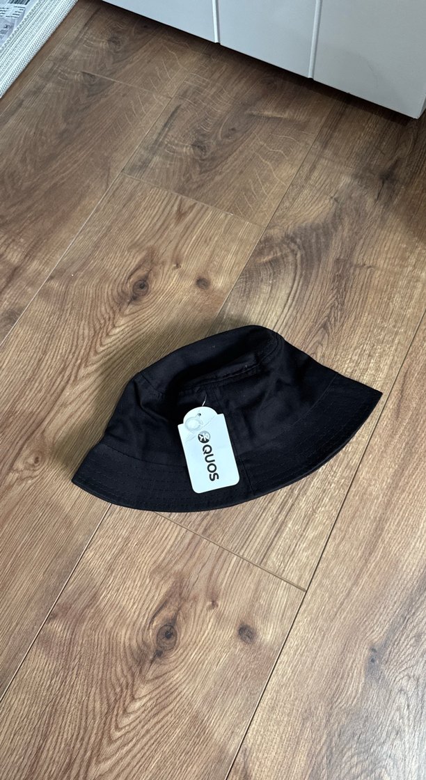 Sentetik kumaştan yapılmış siyah kadın street wear şapka, Velcro kapamalı. Minimalist tasarım ve @QUOS markası bulunur. Trendy günlük tarz için uygun.