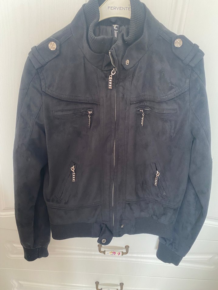 Siyah süet biker ceket, oturtmalı kesim, kesik yaka ve kayışlı kollara sahip. Kemerli, çoklu fermuarlı ceplidir, günlük kullanım için uygundur. Marka: FERVENT.