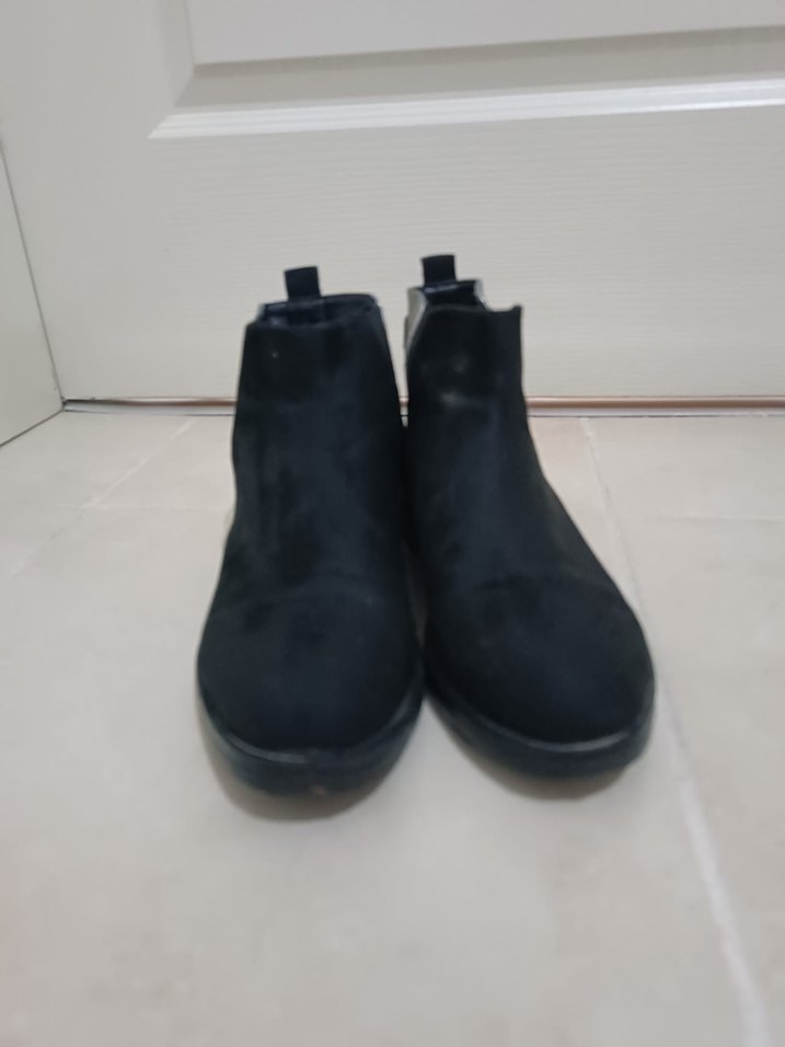 Siyah kauçuk kadın botları, blok topuklu, minimalist gotik tarzıyla günlük kullanıma uygun. küçük deri kısmında deforme var