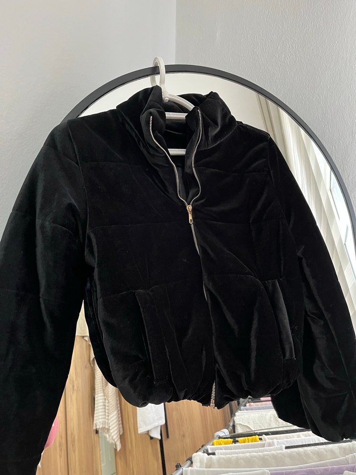 Fermuarlı, yüksek yakalı, siyah süet kumaştan yapılmış, uzun kollu ve midi uzunlukta, rahat ve şık bir kadın ceketi. kolunda küçücük bir sigara yanığı fotoğrafa ekledim