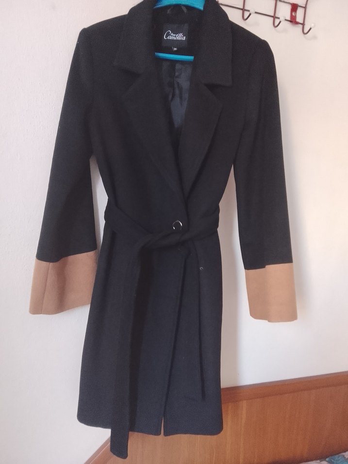 Siyah süet kumaştan, kemerli ve uzun kollu kadın kaban. Kollarında kahverengi detaylar bulunur, ofis kullanımı için uygundur.