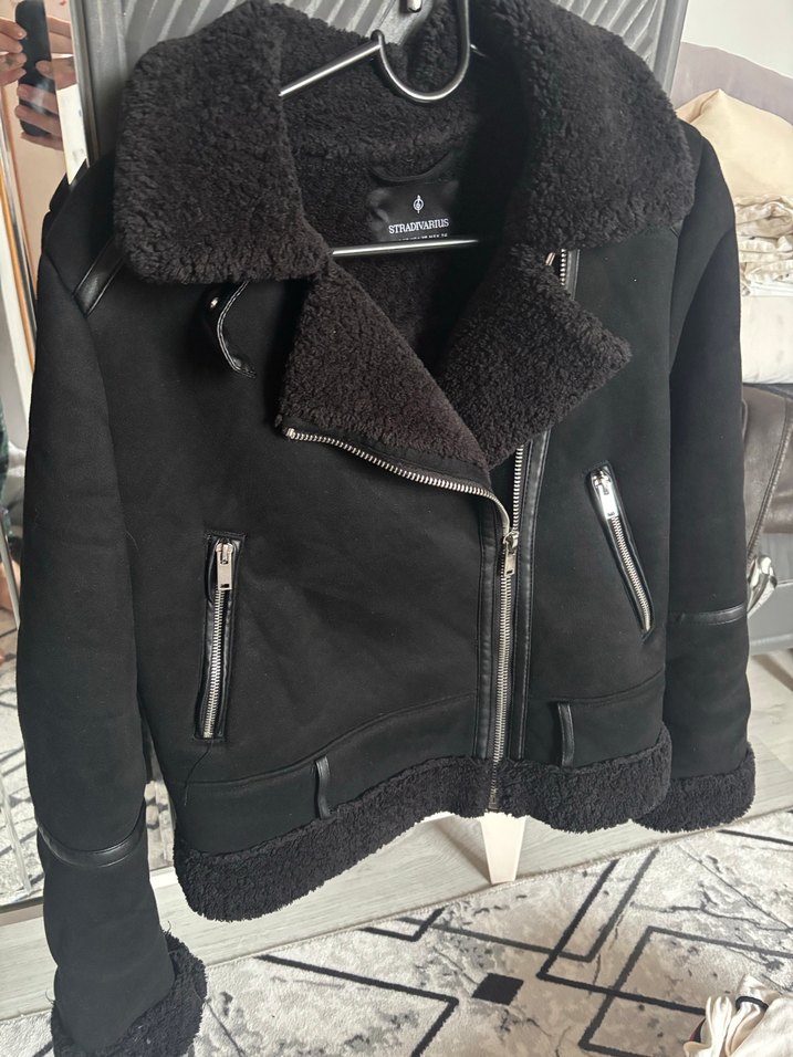 Siyah süet biker ceket, kürk detaylı, kesik yakalı ve midi boyda, ince kesim ile rahat ve şık bir görünüm sunar.