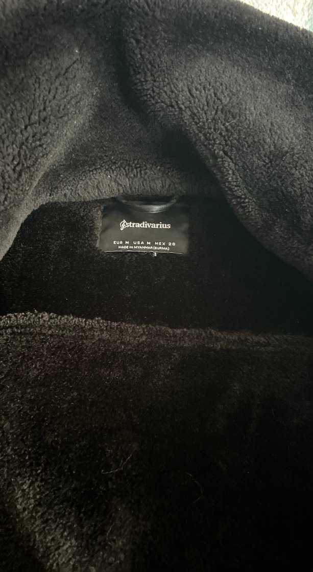 Siyah süet kumaştan, kapüşonlu ve kürk detaylı, rahat ve şık sokak tarzı uyumlu Stradivarius marka bir ceket.