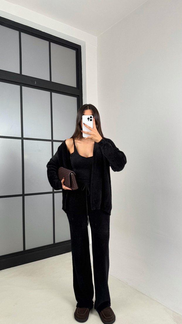 Siyah Kadın Süet Midi Hırka 3 Parça