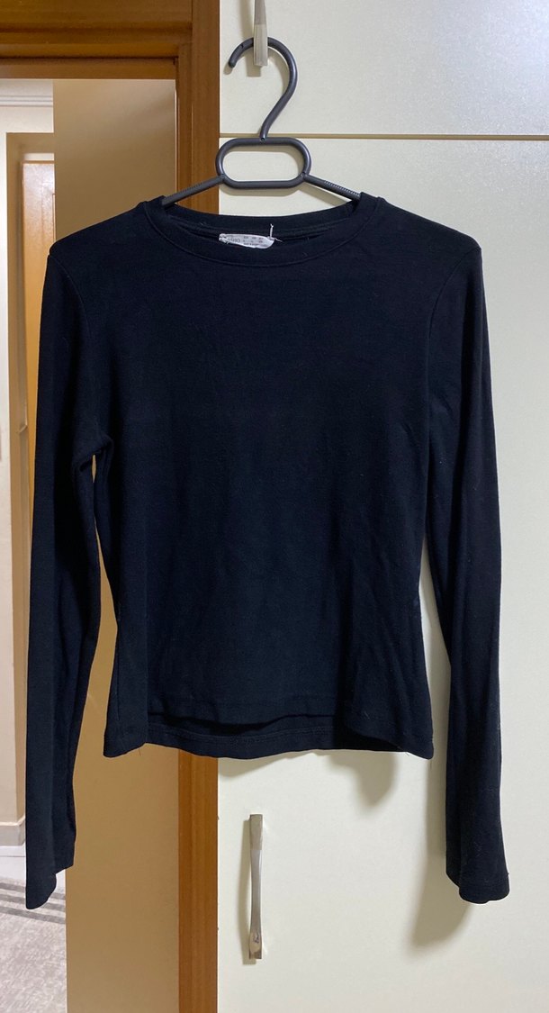 Siyah, uzun kollu ve yuvarlak yakalı, süet kumaştan yapılmış fitted kadın kazak. Minimalist ve normcore tarzıyla günlük kullanıma uygun şık parça.