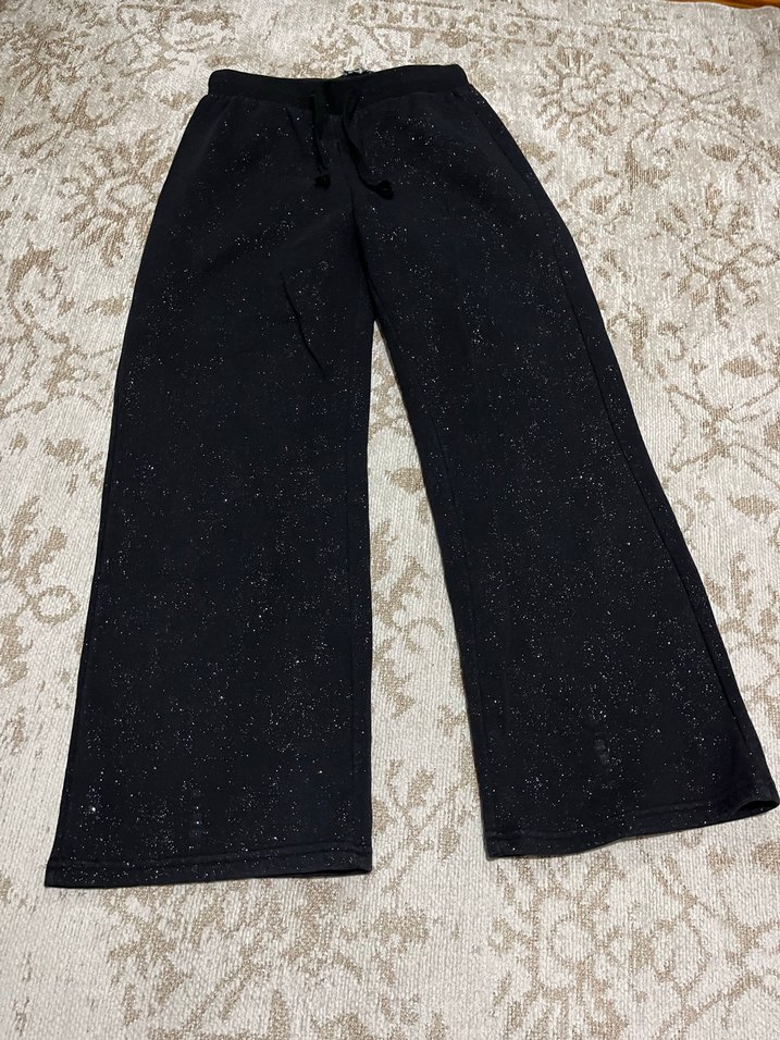 Siyah, suni kürk detaylı, rahat kesim kadın pantolon. Yumuşak sentetik kumaştan, midi boy, desensiz ve günlük kullanıma uygun.