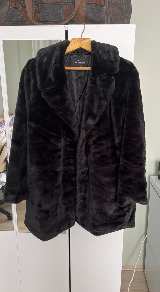 Siyah suni kürk kaban, yaka detaylı ve uzun kollu, bol kesim ve midi boyda. Yumuşak ve rahat kumaşıyla gündelik ve ofis kullanımına uygundur. Şık kürk model kaban