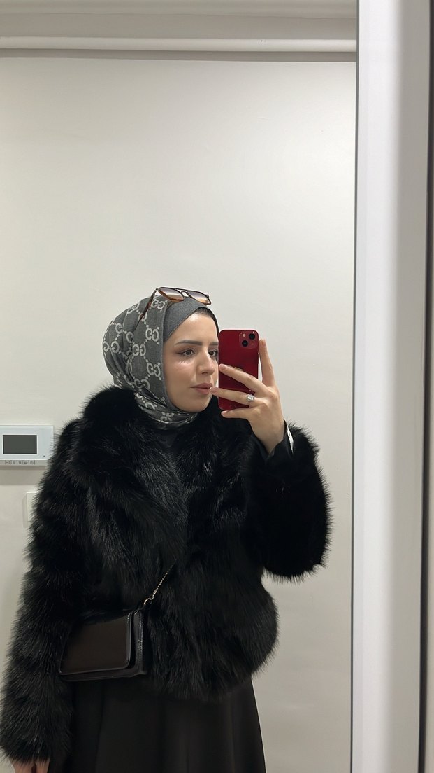 Yumuşak suni kürkten yapılmış, yüksek yakalı ve uzun kollu siyah fitted kaban. Etnik desen detaylarıyla günlük sokak stili için uygun.