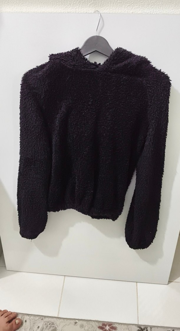 Siyah, yumuşak ve rahat fleece kumaştan, uzun kollu, bisiklet yaka, midi uzunlukta ve kürk detaylı düz tasarımlı, vücuda oturan kadın sweatshirtü. Günlük kullanım için uygundur.