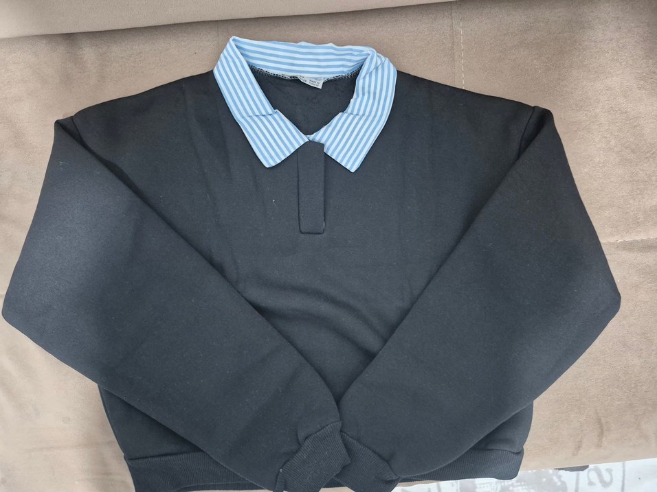 Çizgili yakalı, uzun kollu, siyah kadın sweatshirt. Rahat kesim ve yumuşak, sıcak kumaştan üretilmiştir. 3 iplik şardonlu ürün boy50cm
