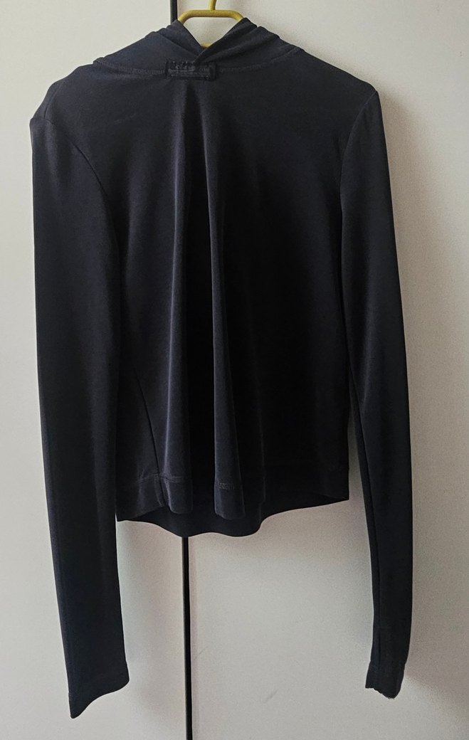 Siyah renkte, ince kumaşlı, uzun kollu, vücuda kısmi bol şekilde oturan midi uzunlukta kadın sweatshirt. Minimalist tarzda, spor giyim, sokak tarzı için uygundur. Small beden. Şapkalı ve baş parmak için iki kolda da yeri var. Merak ettiğiniz şeyleri sormaktan çekinmeyin. ❤️