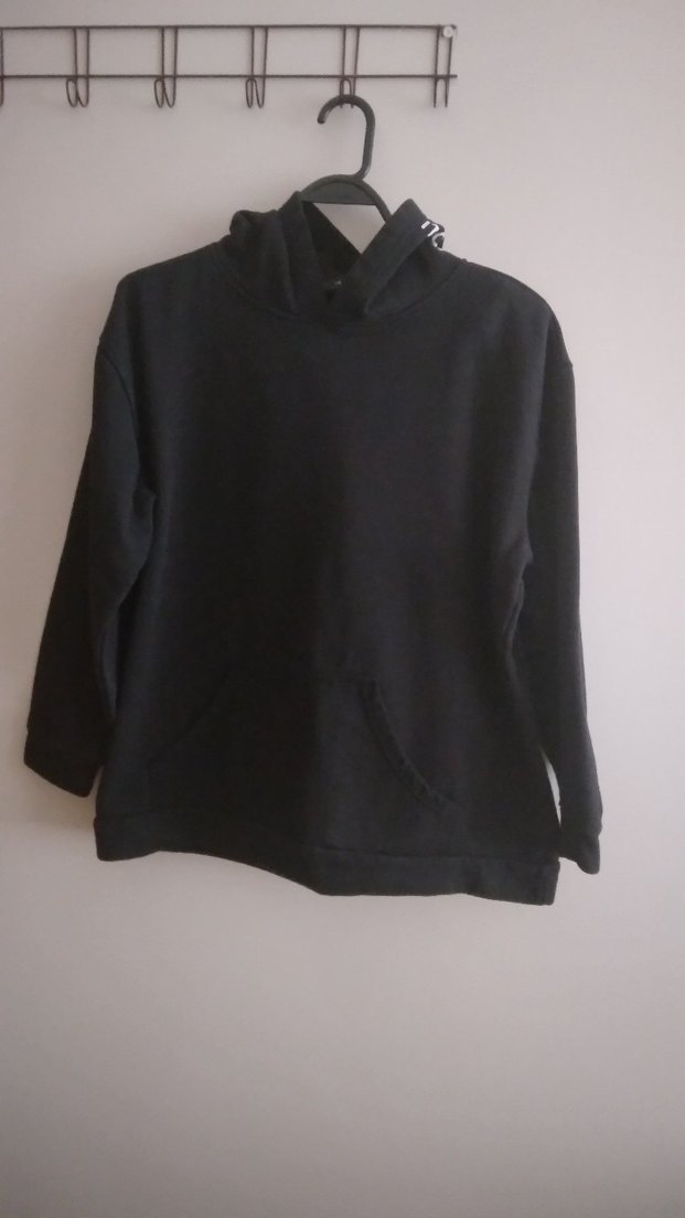 Siyah renkte, yuvarlak yaka ve uzun kollu, kapişonlu kadın sweatshirtü. Salaş kesimi ve yumuşak, sıcak kumaşıyla rahat bir kullanım sağlar. Günlük ve sokak stiline uygundur.