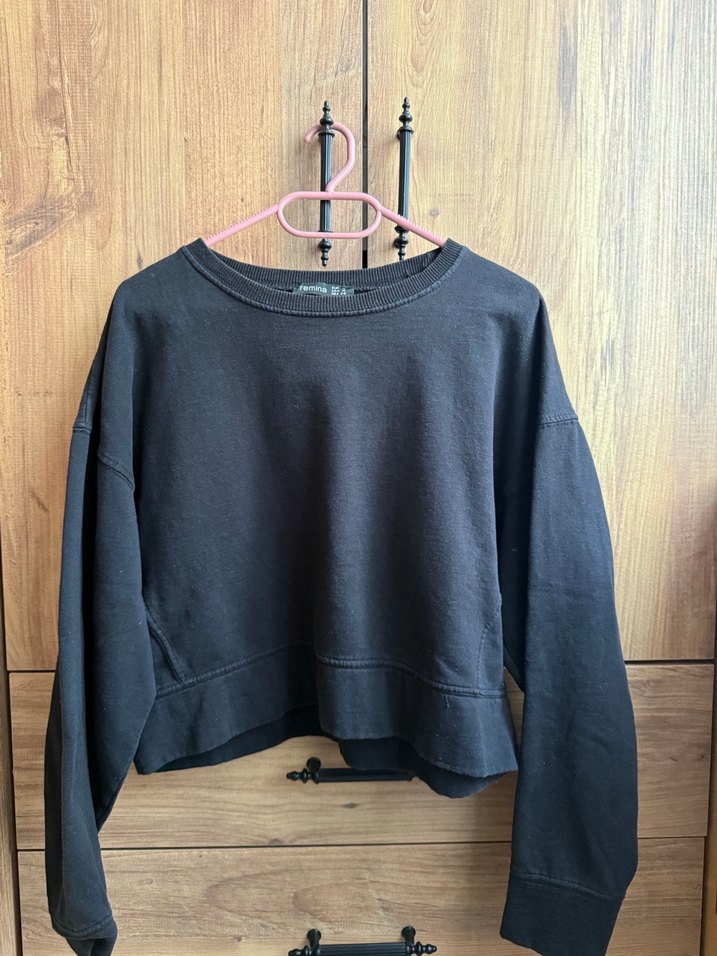 Siyah kadın sweatshirt, yuvarlak yaka ve uzun kollu, rahat kesim ve normal midi boyda. Yumuşak, sıcak kumaştan yapılmış, gündelik şıklık sunar.