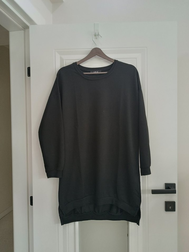 Siyah midi uzunluğunda, yuvarlak yakalı ve uzun kollu kadın sweatshirt. Yumuşak ve sıcak kumaştan, rahat ve şık bir görünüm sunar.